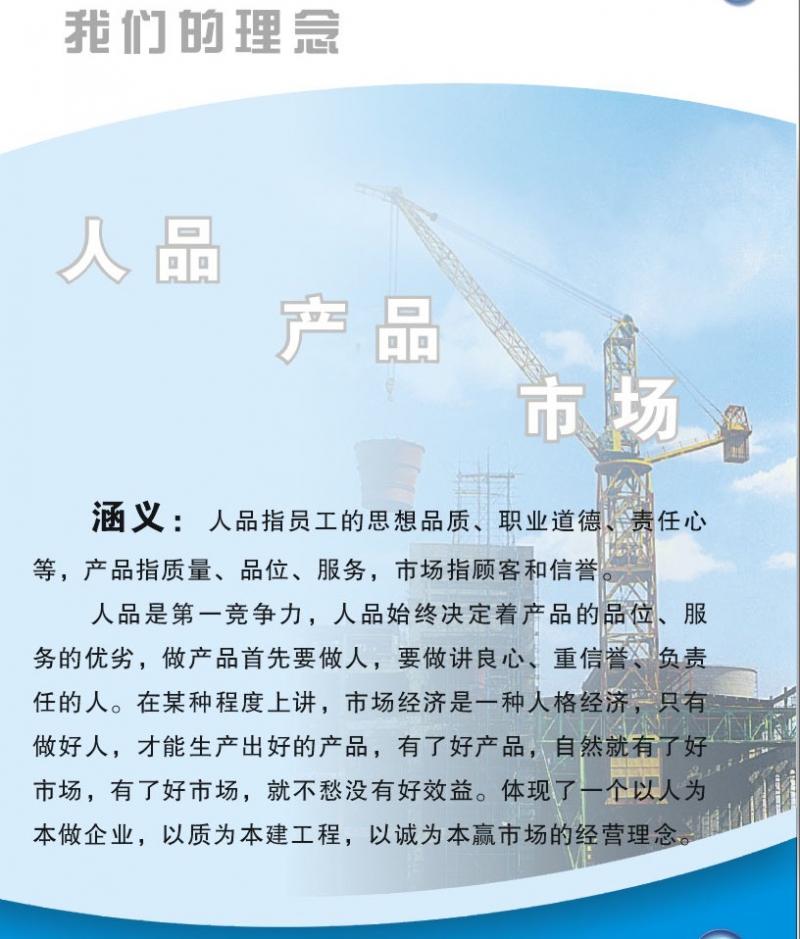 人品是第一競(jìng)爭(zhēng)力,人品始終決定著產(chǎn)品的品位,服務(wù)的優(yōu)劣,做產(chǎn)品首先要做人,要做講良心、重信譽(yù)、負(fù)責(zé)任的人,在某種程度上講,市場(chǎng)經(jīng)濟(jì)是一種人格經(jīng)濟(jì),只有做好人,才能生產(chǎn)出好的產(chǎn)品,有了好產(chǎn)品,自然就有了好市場(chǎng),有了好市場(chǎng),就不愁沒(méi)有好效益。體現(xiàn)了一個(gè)以人為本做企業(yè),以質(zhì)為本建工程,以誠(chéng)為本贏市場(chǎng)的經(jīng)營(yíng)理念。